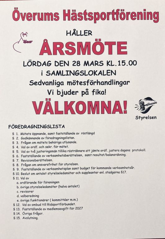 KRISTI HIMMELFÄRD ingen ridning torsdag den 14 maj, fredag 15 maj.
